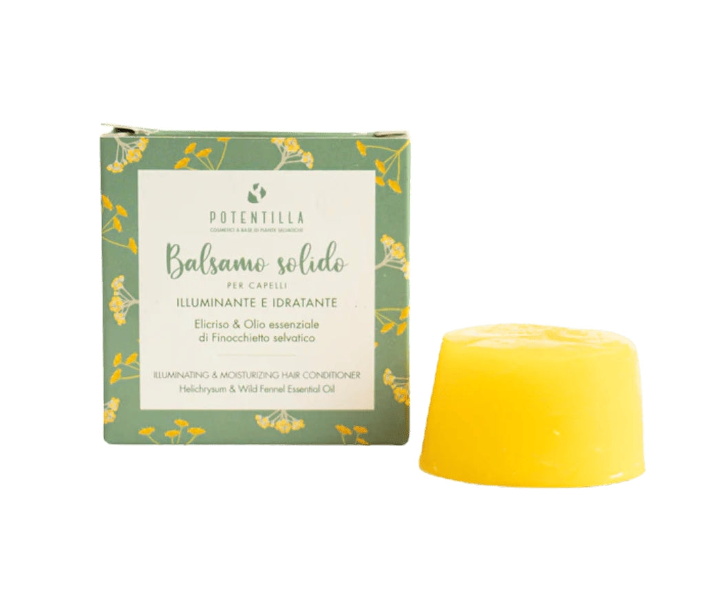 Il Balsamo Solido Illuminante e Idratante - Potentilla è un trattamento post-shampoo in formato solido, pensato per nutrire, proteggere e districare i capelli in modo naturale ed efficace. Realizzato dal brand Potentilla, combina l'azione lenitiva dell’Elicriso con quella purificante e stimolante dell’olio essenziale di Finocchietto Selvatico, per una chioma visibilmente più sana e brillante.