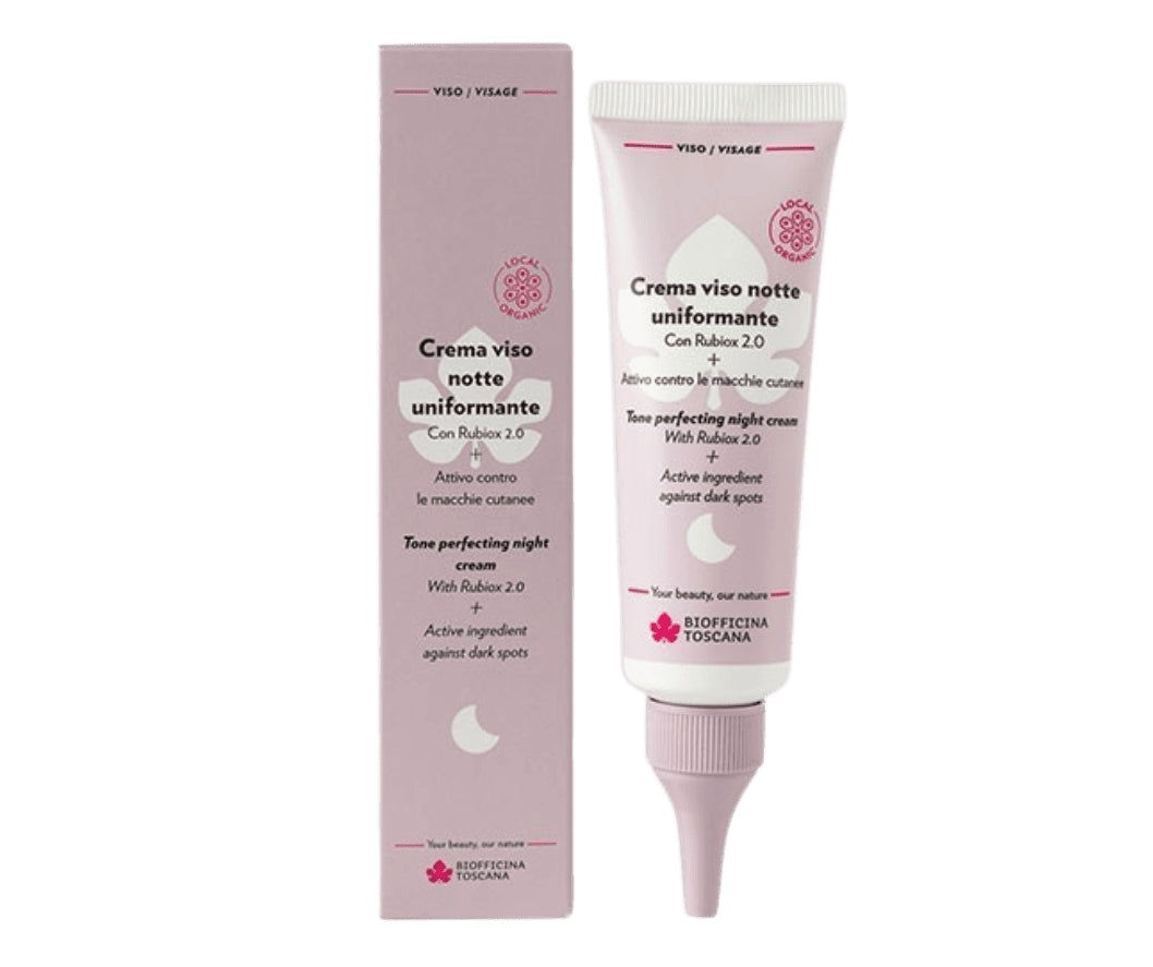 La Crema viso notte uniformante – Con Rubiox® 2.0 + Attivo contro le macchie cutanee di Biofficina Toscana è un trattamento intensivo da notte pensato per contrastare le discromie cutanee e uniformare l’incarnato. Il cuore della formula è il Rubiox® 2.0, un bioliquefatto esclusivo ottenuto da rosa canina naturalmente ricca di vitamina C e frutti rossi biologici toscani (come ribes e lampone), noti per la loro potente azione antiossidante e protettiva.