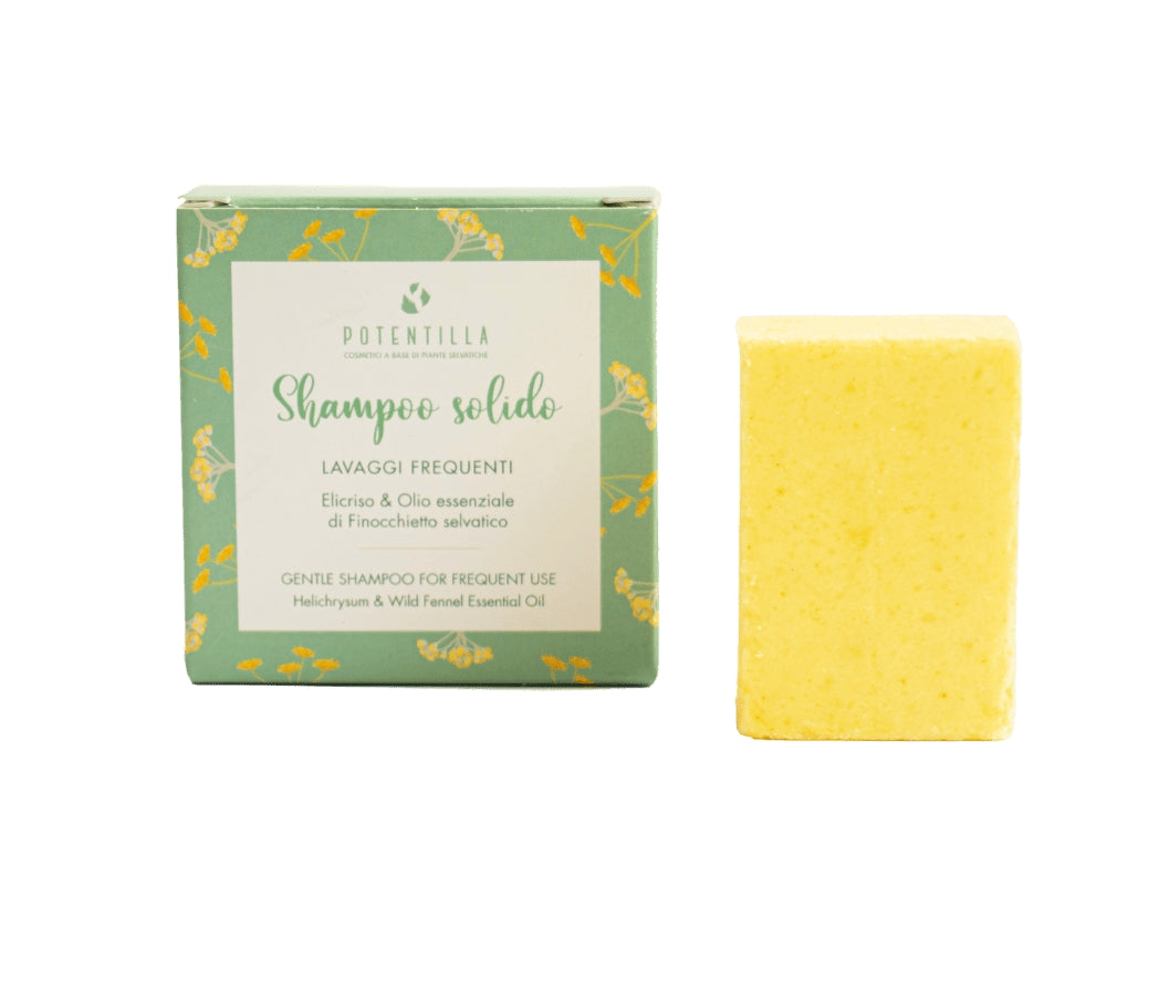 Lo Shampoo Solido Lavaggi Frequenti - Elicriso & Finocchietto Selvatico - Potentilla è studiato per detergere in modo delicato ma efficace anche in caso di uso quotidiano. Formulato dal brand Potentilla, sfrutta tensioattivi di origine vegetale che rispettano il film idrolipidico del cuoio capelluto, mantenendo i capelli sani e forti giorno dopo giorno.
